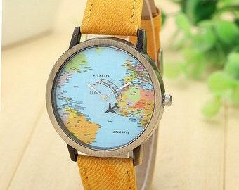 Unisex Watch Denim Leather World Map Dial Analog Quartz Wristwatch Casual Watch
